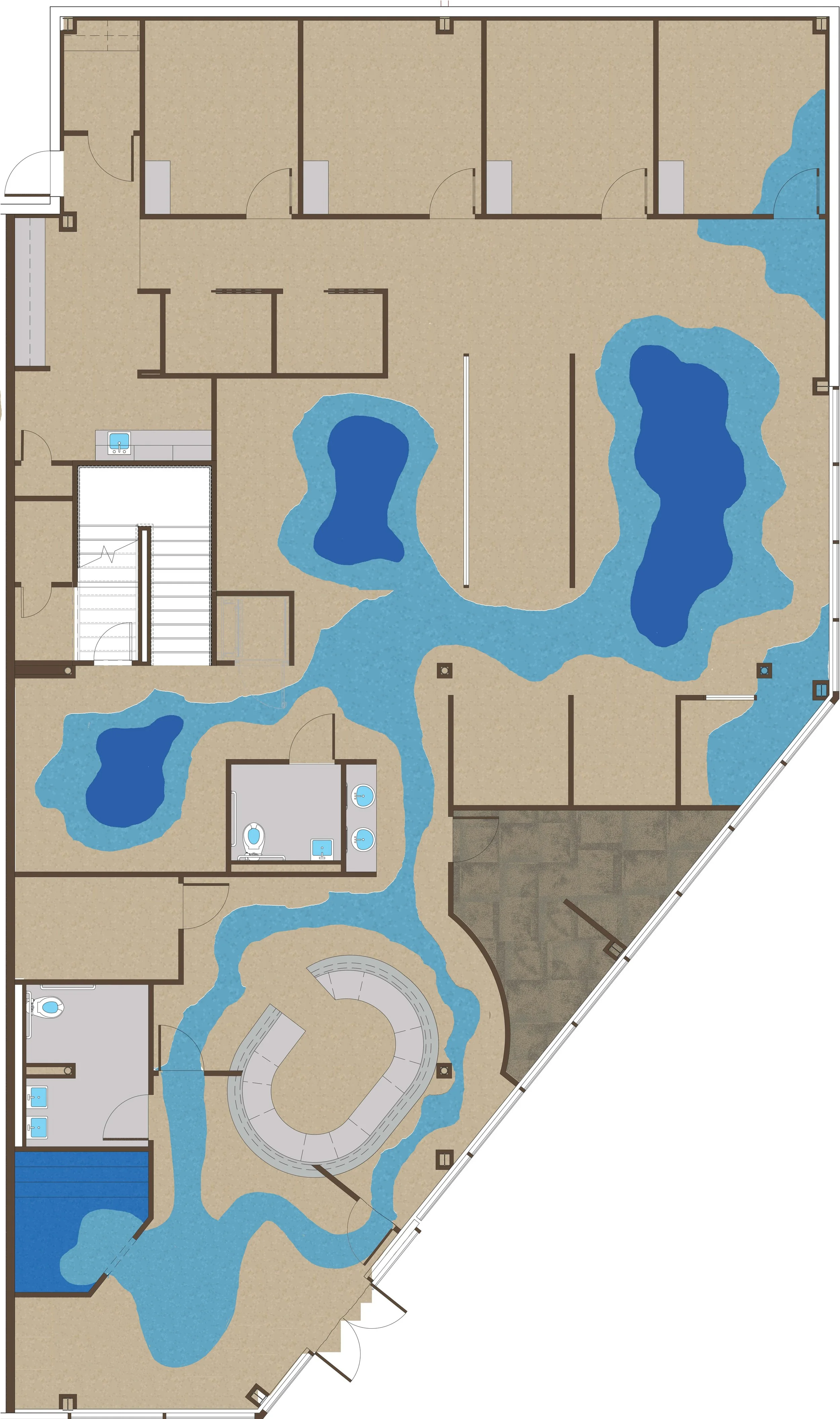 Iterations of floorpattern. The inspiration was a coral reef and the beach. The curved cuts in sheet rubber came in too high so we value engineered to a LVT plank layout.